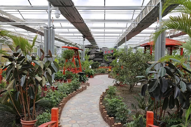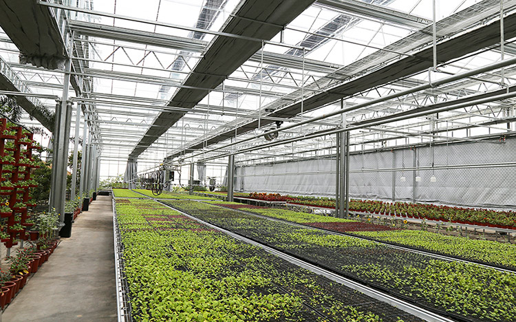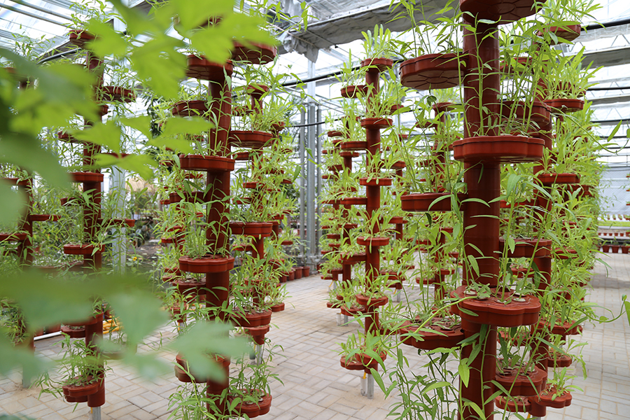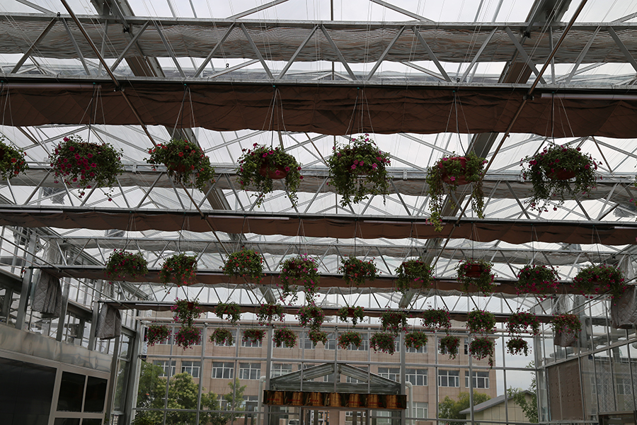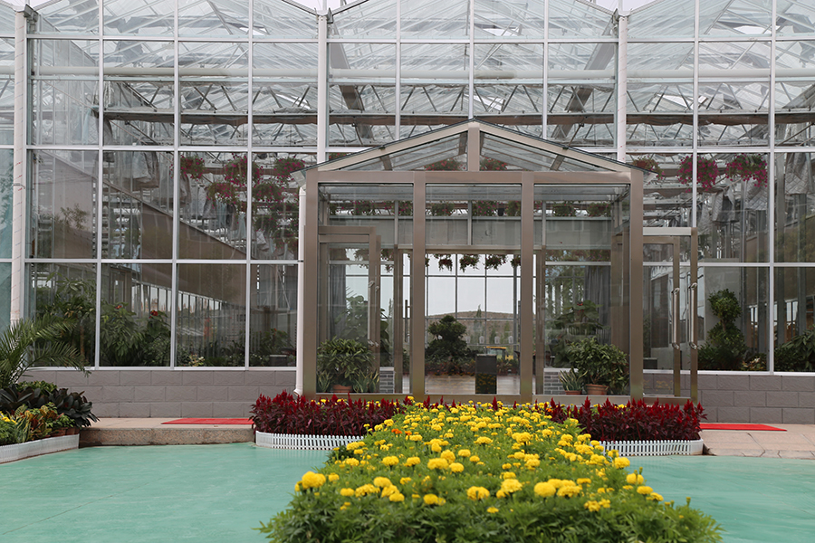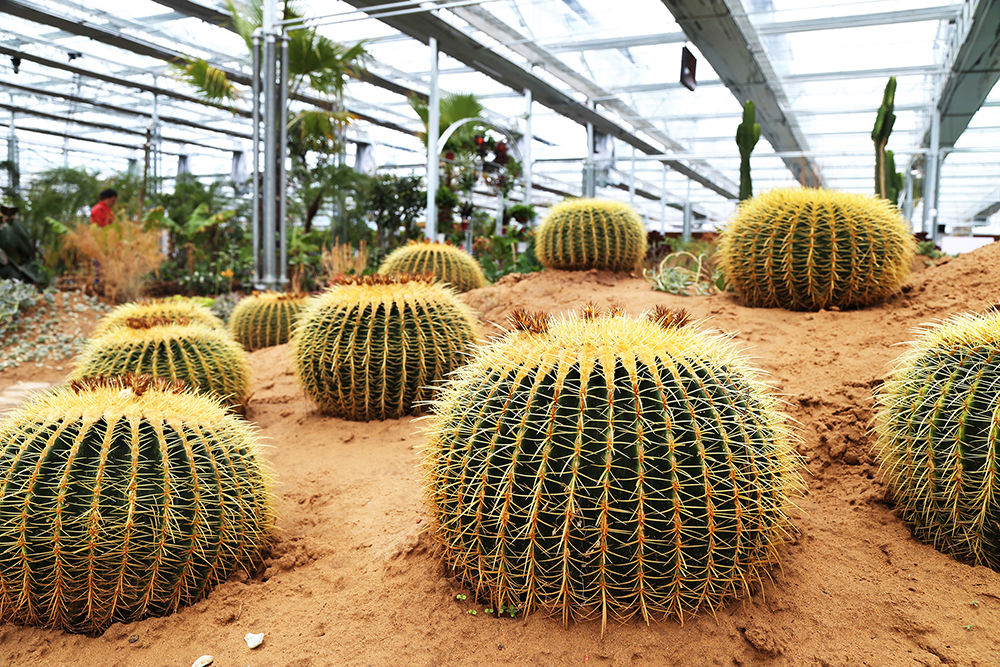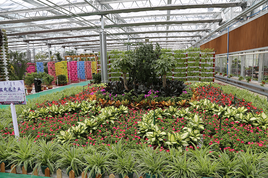 該智能溫室大棚占地約6000平方米,分為一號(hào)廳和二號(hào)廳。其中一號(hào)廳是新建的有錯(cuò)層的玻璃溫室,分為盆栽花卉、盆栽果樹區(qū)、沙生植物區(qū)、熱帶風(fēng)情區(qū)、家庭園藝區(qū)等功能區(qū)。二號(hào)廳由舊溫室改造而成,頂部為陽(yáng)光板,四周立面為玻璃,配置了智能控制系統(tǒng),有無(wú)土栽培區(qū)、育苗區(qū)、采栽體驗(yàn)區(qū)等功能區(qū)。智能溫室全部配備了內(nèi)、外保溫系統(tǒng),冬季保溫,比普通溫室更節(jié)能。溫棚內(nèi)移動(dòng)苗床一次育苗30萬(wàn)株,可供給巴彥霍德406座溫棚,一定程度上帶動(dòng)了農(nóng)民增收。不論是熱帶植物、水果還是沙漠植物,在這里你可以一覽無(wú)余,一年四季感受綠色勃勃生機(jī)。