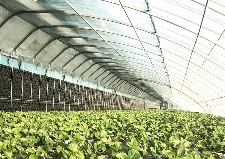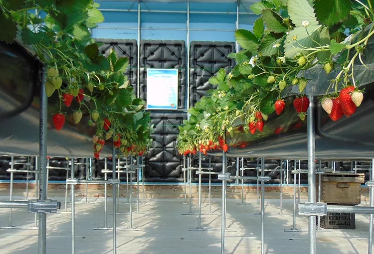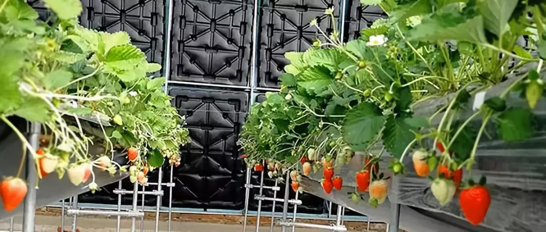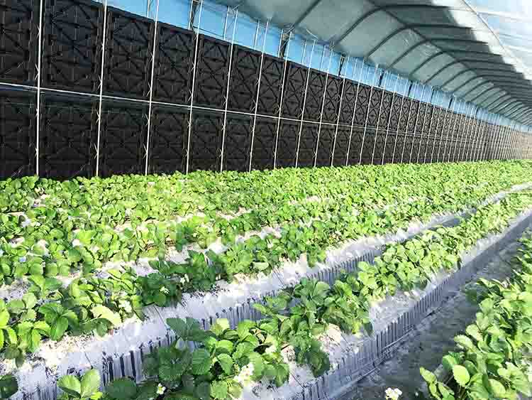 為了達(dá)到合理蓄熱的目的,日光溫室蓄熱系統(tǒng)也經(jīng)歷了土墻、磚墻墻體保溫到相變材料的不斷更新。受傳統(tǒng)日光溫室蓄熱材料粘土或磚本身的物理性質(zhì)的限制,能達(dá)到的蓄熱量有限。理論上,選用比熱容更高的水可能會(huì)收獲更多蓄熱量。粘土或磚的比熱容分別僅為水的1/3和1/4,也就是說(shuō)單位質(zhì)量的水蓄熱內(nèi)外雙保溫裝配式日光溫室蓄熱體每升高或降低1℃可以吸收或放出的熱量是土墻或磚墻3~4倍。實(shí)踐證明,水蓄熱墻體的蓄熱能力顯著強(qiáng)于土墻或磚墻。崔世茂教授介紹說(shuō),在水蓄熱內(nèi)外雙保溫裝配式日光溫室中,水箱墻體蓄熱方面有明顯創(chuàng)新,蓄熱技術(shù)主要是利用太陽(yáng)能白天照射加溫水箱,晚上通過(guò)水箱持續(xù)放熱保持溫室內(nèi)溫度可達(dá)到6 ℃以上(同期室外氣溫-30 ℃),夜間增溫效果顯著,這樣就能夠保證溫室中越冬生產(chǎn)栽培的草莓和番茄可以正常生長(zhǎng),產(chǎn)量高、品質(zhì)好!